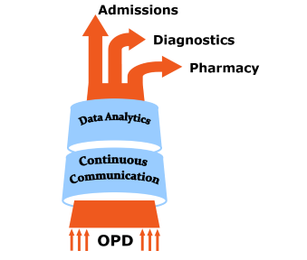 Usually, OPD patient life cycle runs from few days to years. However, the hospital has few touch points with patients which typically last an hour at max. Most of IP patients go through few OP cycles, but are hardly engaged by the hospital to stay. This is where Health-PIE Bot comes to rescue. It stays with patients throughout the treatment, ensuring stickiness. This helps improve OP to IP conversion.